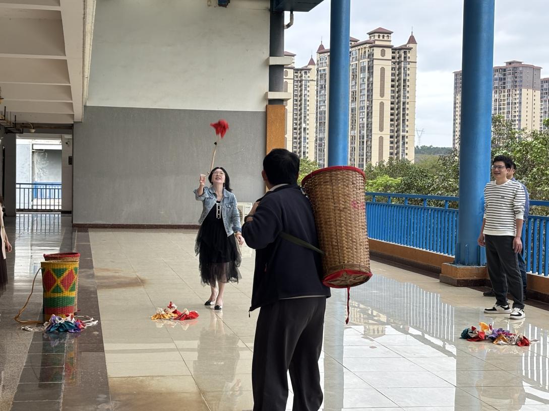 抛绣球作为广西壮族传统体育项目,兼具竞技性与趣味性。本次比赛设置“规定距离投掷”和“规定数量投掷”两个环节,要求选手在限定距离内将绣球精准投入搭档所背的背篓中,以投中数量作为评分依据。赛场上,教师们一改平日严肃形象,化身运动健将——有的凝神瞄准、稳健发力,绣球在空中划出优美弧线;有的灵活调整姿势、巧妙控制力度,展现出对传统技艺的深入理解与娴熟运用。