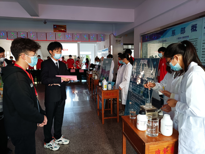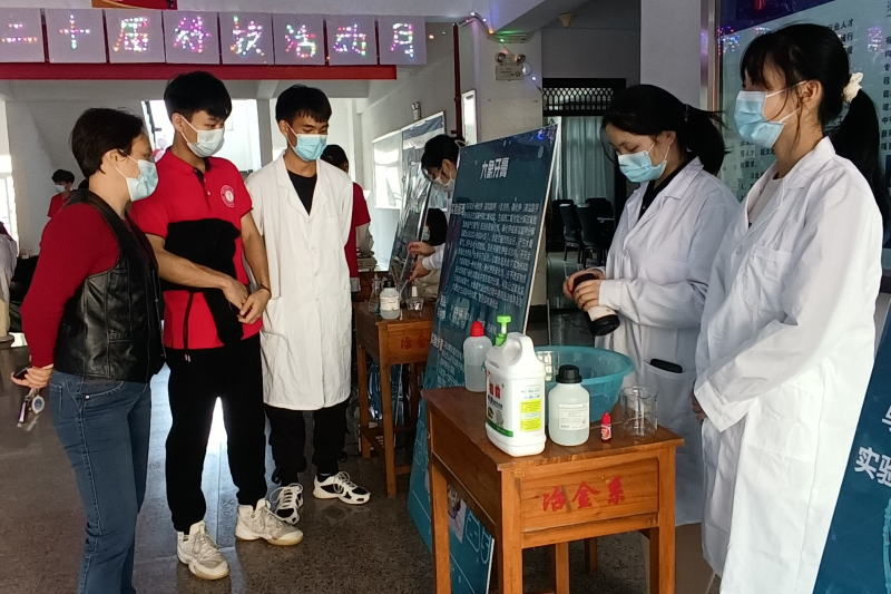 作品展上,矿石展示区摆放的各种矿石标本尤受欢迎,众多师生驻足观看和拍照留念。科学实验展区的固体酒精、竹签上刻字法、大象牙膏、一色变四色、密信、蔬菜中维生素C的测定、热冰实验等现场实验,纷纷展现了神奇的一面,在老师的指导下我系学生对实验操作跃跃欲试。我系主任何贵香就矿石标本对同学们进行了讨论交流,提高了我系同学对矿石知识探究的兴趣。
