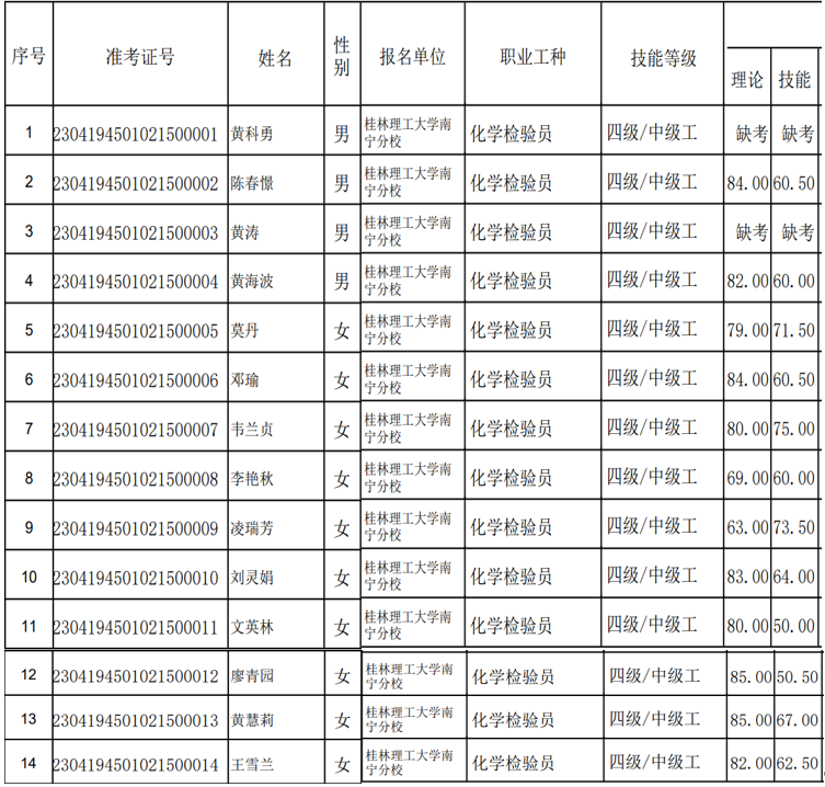 根据《广西壮族自治区人力资源和社会保障厅关于开展社会培训评价组织职业技能等级认定试点工作的通知》(桂人社函(2020)203号)等有关文件要求,为确保职业技能等级认定的公平公正,现对广西理工职业技术学校2023年4月27日14人参加化学检验员(中级14人)考试,合格人数10人的职业技能等级认定人员成绩进行公示,公示期为本公示发布之日起5个工作日:2023年5月10日—5月16日。