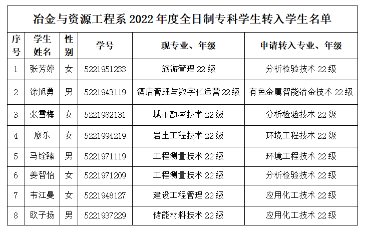 现将张芳婷等8名学生转专业情况予以公示,公示时间从2022年12月12日至2022年12月14日,公示期为3天。在公示期内,若对转专业名单有异议,请以书面形式向系部反映。反映意见的材料需手签真实姓名及联系方式投递到5209-2办公室,凡以匿名形式反映意见的不予受理。