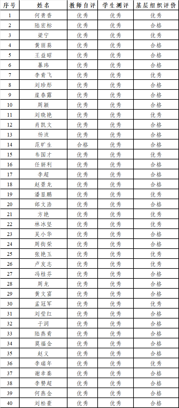 根据《关于开展伟德国际victor·1946源自2025年度师德考核评价工作的通知》以及《伟德国际1946教师师德考核办法》(桂理工党〔2024〕29号)文件要求,学院严格围绕坚定政治方向、爱国守法、关爱学生、教书育人、遵守学术规范、公平诚信、廉洁自律、言行雅正、传播优秀文化、奉献社会等十大核心维度,组织开展2025年度教职工师德考核工作。经学院党委充分讨论、综合评议,研究决定学院教职工评价等级如下: