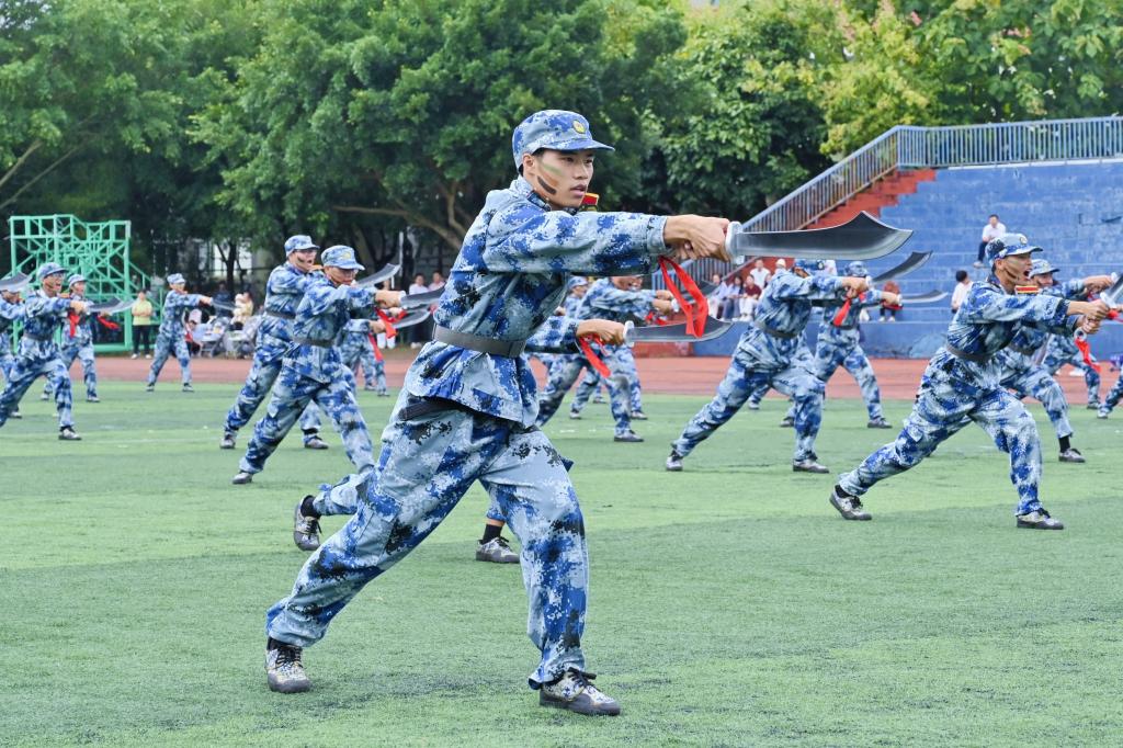 上午9时,在高亢嘹亮的国歌声中,学校党委副书记黎贞崇宣布军训科目展示暨总结大会开始。