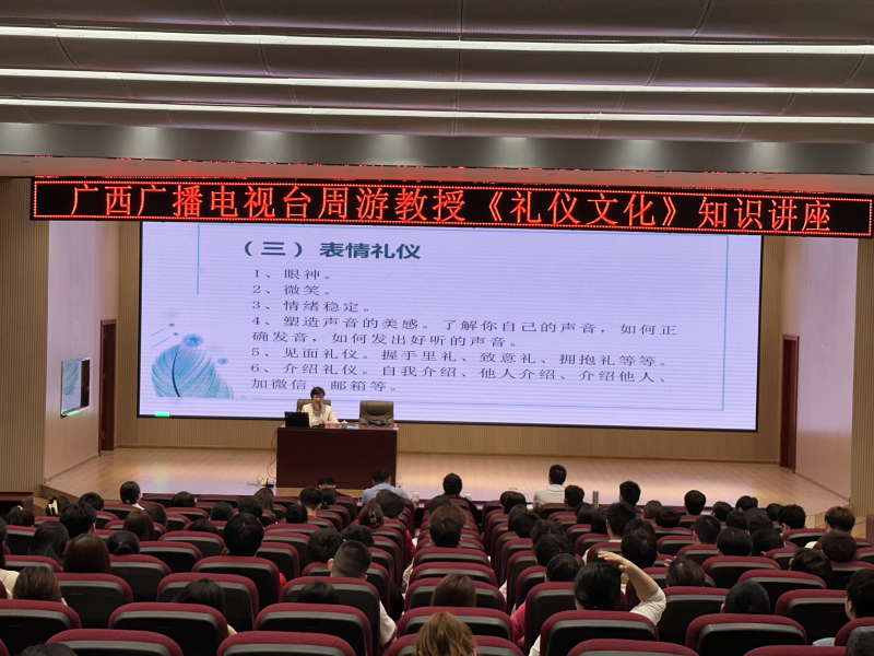 为了进一步加强师生礼仪文化教育,4月3日上午,广西广播电视台播音指导、广西大学硕士研究生导师周游教授应邀在空港校区8408报告厅为伟德国际victor·1946源自师生作《礼仪文化》知识讲座。伟德国际victor·1946源自副校长陈东莲出席讲座,伟德国际victor·1946源自党政办公室、财务工作部全体人员,各职能部门、系部师生代表,分校礼仪队,学生社团代表近300人现场聆听讲座。
