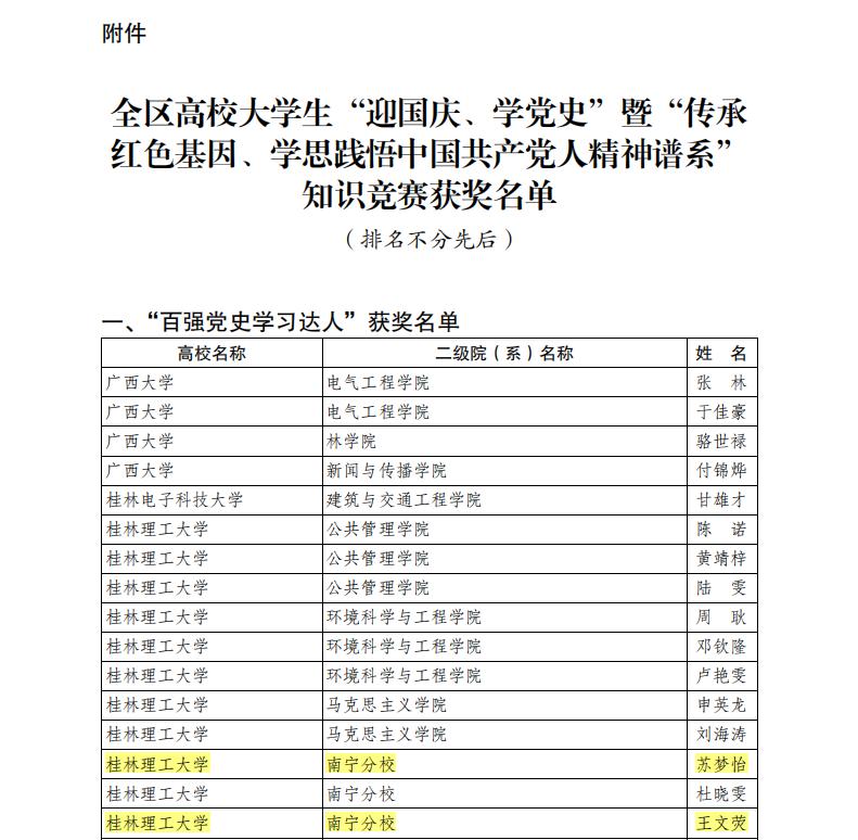 近日,由自治区党委党史研究室和自治区教育厅联合主办的“迎国庆、学党史”暨“传承红色基因、学思践悟中国共产党人精神谱系”知识竞赛活动圆满落幕。我院学生苏梦怡、王文荧在活动中获评“百强党史学习达人”,学生覃海福、黄运运、李挺杰获评“党史学习达人”。