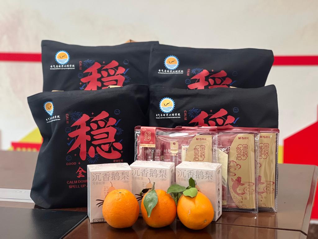学院领导为在场的考研学子们发放了寓意深刻且实用的“金榜题名”礼包,礼包内有应考文具、蒸汽眼罩、香橙等物品,寓意着同学们在考试中心想事“橙”。