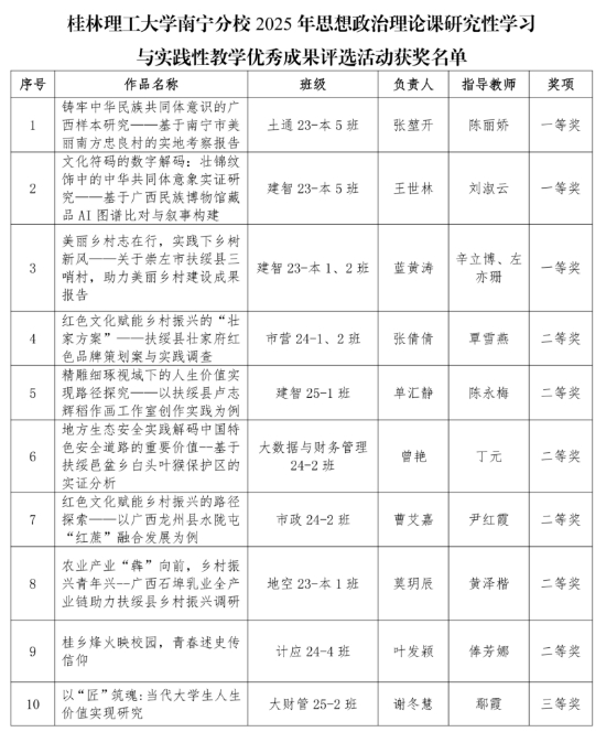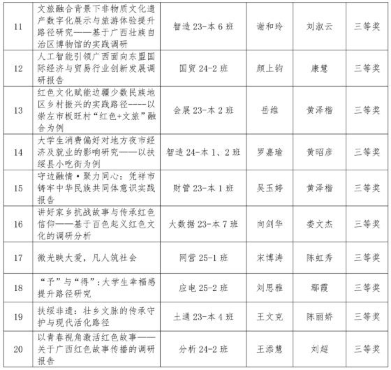 活动围绕广西地区的经济社会发展、乡村振兴、文化传承与社会奉献行为等主题,组建团队深入社区、乡村、企业开展实地调研,将理论知识与社会现实问题紧密结合,创作了一批兼具思想深度、实践价值与创新意识的优秀作品。经过评审,最终选出一等奖作品3件、二等奖作品6件、三等奖作品11件,以及优秀指导教师3名。