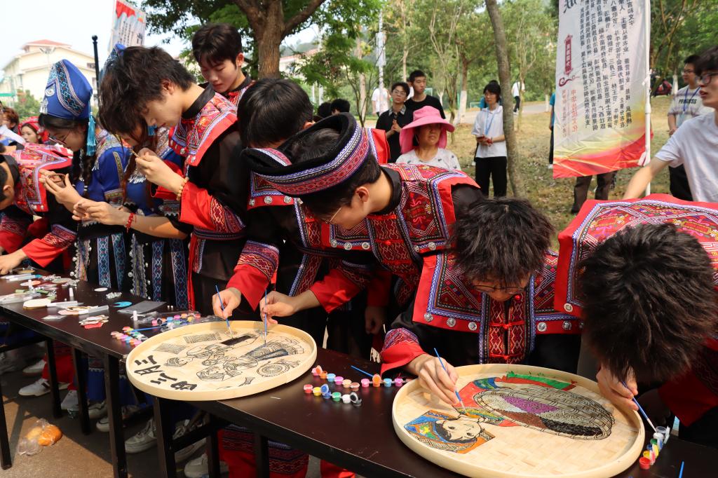 运动会期间,与会领导、嘉宾一行还参加了伟德国际victor·1946源自“广西三月三・八桂嘉年华”主题活动,现场观看了竹竿舞、打榔舞等民族风情文艺展演,体验了簸箕画、投壶等民俗趣味互动项目,品尝了八桂特色民族美食,在浓郁的民族文化氛围中,深切感受南宁分校铸牢中华民族共同体意识、丰富校园文化生活的生动实践。