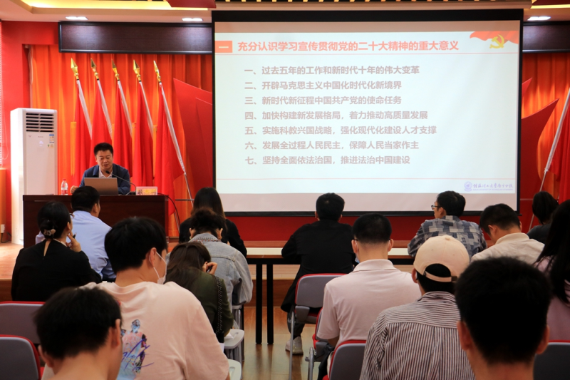 会议伊始,耿杰利从“充分认识学习贯彻党的二十大精神的重大意义”、“全面准确学习领会党的二十大精神”、“认真做好党的二十大精神的学习宣传”三个方面作专题辅导。他指出,师生党员要学深悟透党的二十大精神,在全面学习、全面把握、全面落实上下功夫,做到学习领会上入脑入心,贯彻落实上见行见效,将党的二十大精神转化为干事创业的务实行动。他表示,教师党员要带头做新时代的好老师、大先生,要把党的二十大精神融入到思政课当中,推动进教材、进课堂、进头脑;青年学生党员要牢记习近平总书记的殷切嘱托,要锤炼品德修为、涵养高尚情操,要强化知识学习、提升技能水平,要切实躬行实践、勇敢担当作为,努力做敢想敢为又善作善成的好青年。