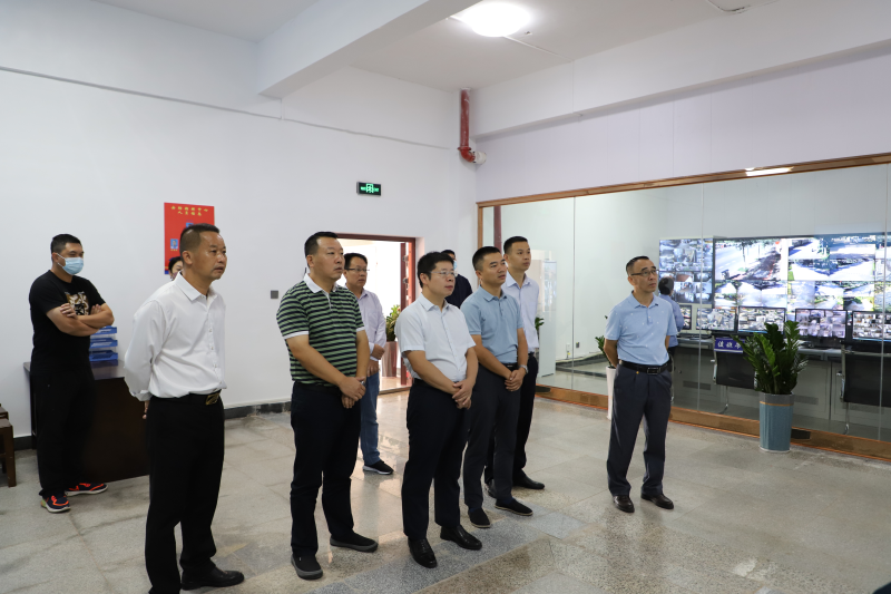 学校党委常委、副校长邓国彬(前排左三)在空港校区校园安防指挥中心检查工作