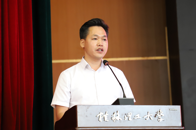 典礼上,学校党委书记邓军为新生代表佩戴校徽,标志着每位新生将以“桂工人”的身份开启崭新的大学生活。