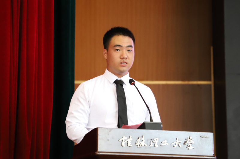 2022级新生代表、机械与控制工程系工业机器人技术3班林智强同学发言,他表示将秉承“厚德笃学、惟实励新”的桂工校训,坚定理想信念,肩负历史使命,做心胸宽广、勤奋好学、求真务实、艰苦奋斗、开拓创新的桂工学子。