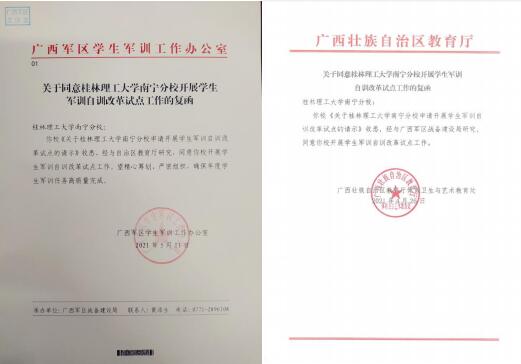 近日,根据广西军区学生军训工作办公室和自治区教育厅体育卫生与艺术教育处《关于同意伟德国际victor·1946源自开展学生军训自训改革试点工作的复函》通知,伟德国际victor·1946源自将于2021年开展学生军训工作改革,成为广西首个军训自训改革试点单位。
