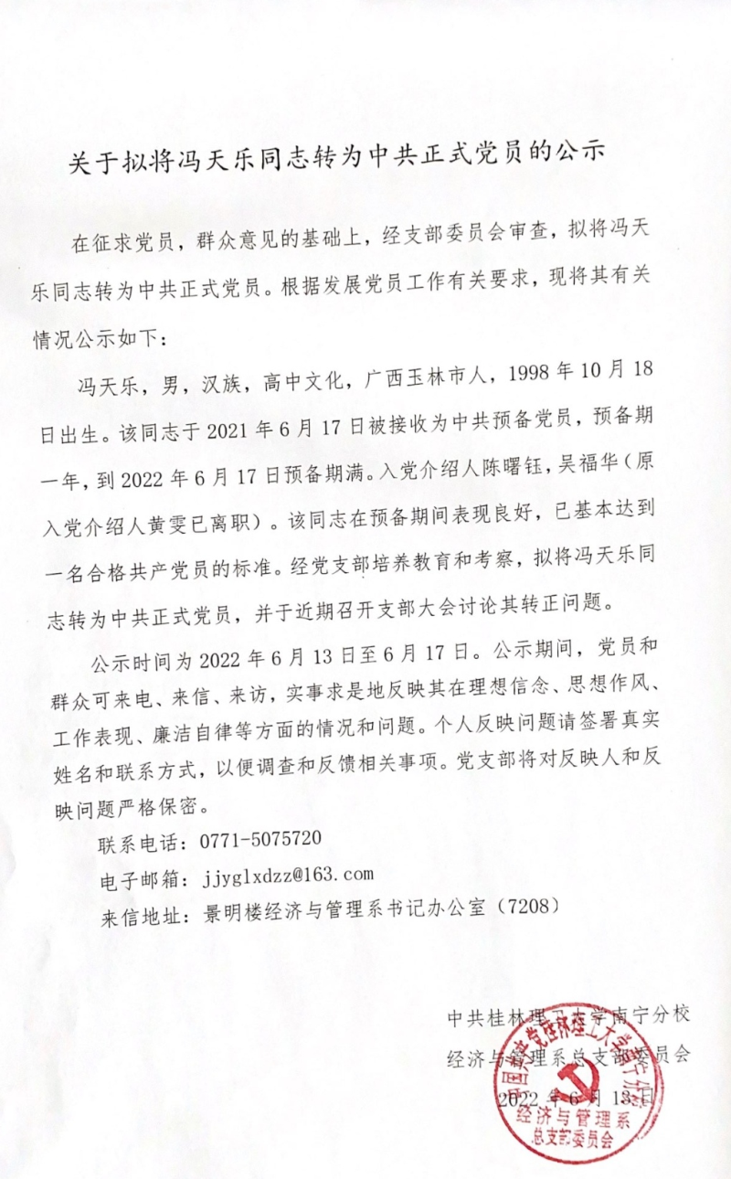 关于拟将冯天乐同志转为中共正式党员的公示