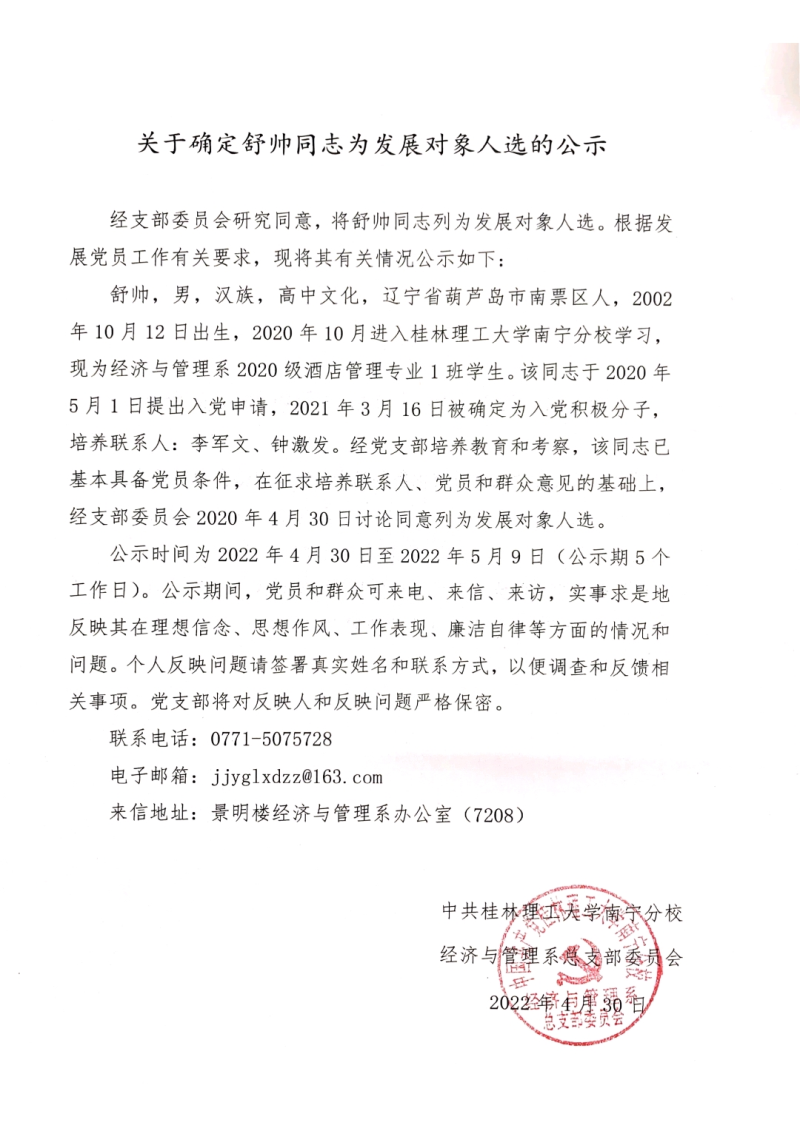 关于确定舒帅同志为发展对象人选的公示
