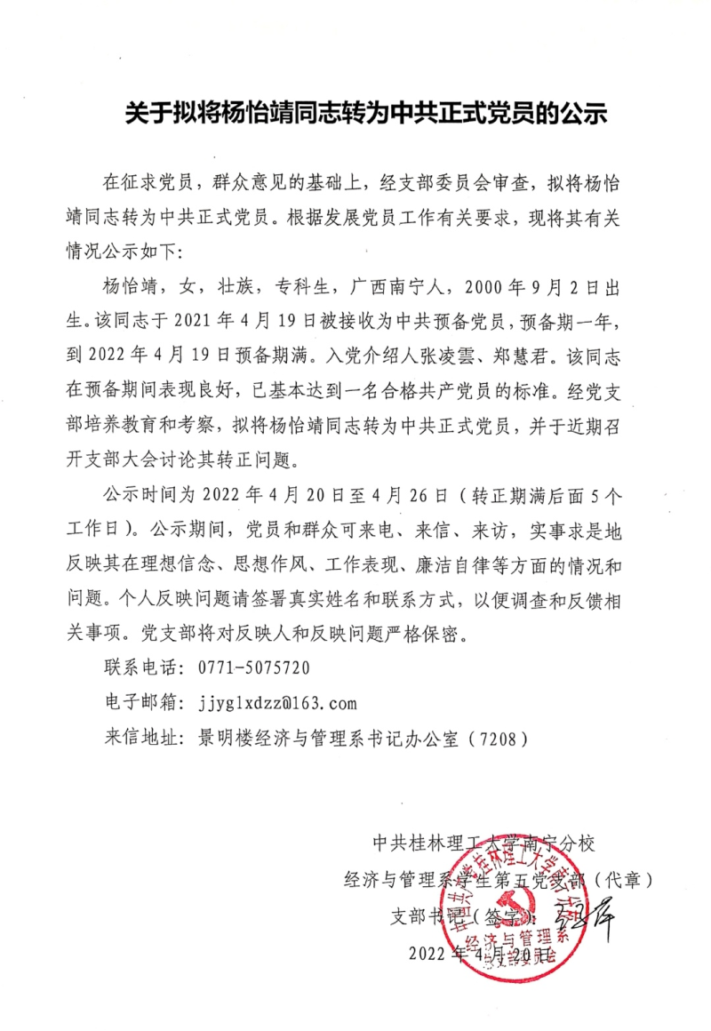 关于拟将杨怡靖同志转为中共正式党员的公示