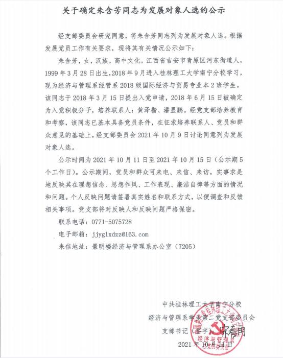 关于确定朱含芳同志为发展对象人选的公示