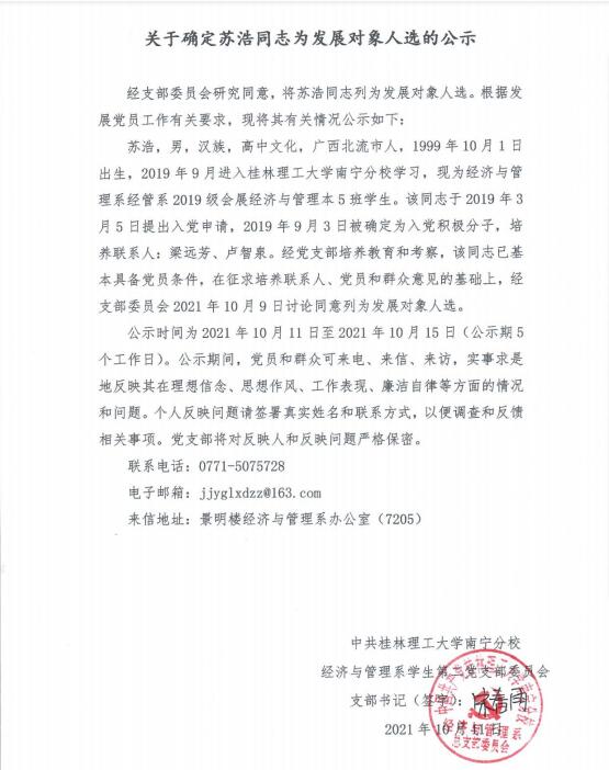 关于确定苏浩同志为发展对象人选的公示