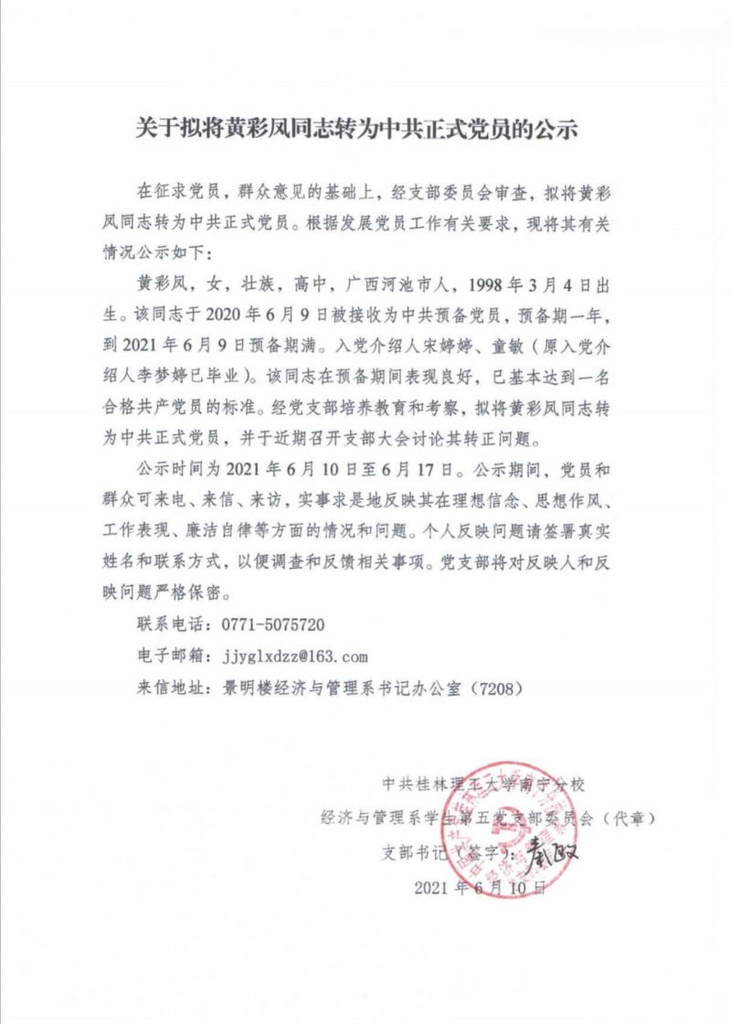 关于拟将黄彩凤同志转为中共正式党员的公示