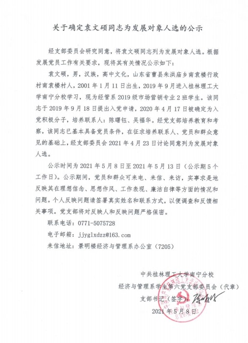 经济与管理系学生第六党支部关于确定袁文硕同志为发展对象入选的公示