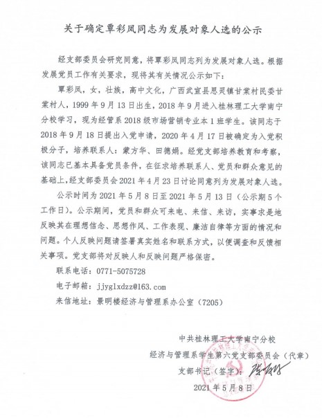 经济与管理系学生第六党支部关于确定覃彩凤同志为发展对象入选的公示