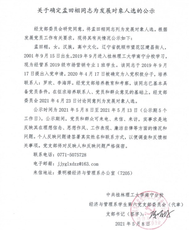 经济与管理系学生第六党支部关于确定孟田栩同志为发展对象入选的公示