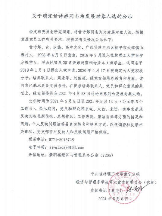 经济与管理系学生第六党支部关于确定甘诗婷同志为发展对象入选的公示