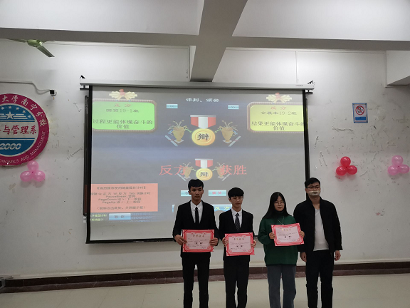 本次决赛队伍为2019级国贸1班与2019级会展本2班,就“过程与结果谁更能体现奋斗的价值”着以辩题展开了激烈的角逐。双方选手引经据典,给我们呈现了一场精彩纷呈的比赛比赛最终由会展本2班取得冠军、国贸1班取得亚军,会计3班取得季军。国贸1班罗仁雪选手获得最佳辩手称号。