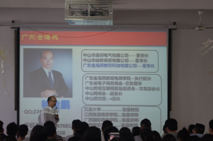 4月20日下午,广东金海燕教育科技有限公司董事长、中山市跨境互联网贸易促进会常务副会长、广东省电子商务商会常务理事、中山网商会副会长钟金鹏先生应邀在空港校区启智楼201教室为经管系学生开展了题为“大学生路在何方”的讲座。讲座由该系副主任劳国炜主持。该系200余名学生一同聆听了讲座。