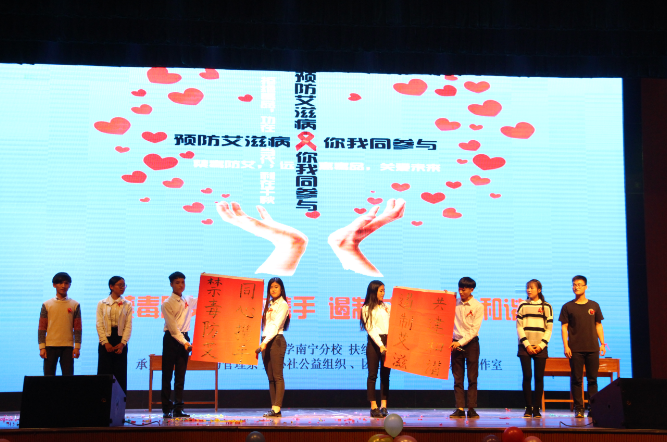 今年的活动主题为“禁毒防艾,同心携手,遏制艾滋,共建和谐”。分校保卫工作部副主任邹志友,团委书记谢晓明,扶绥疾控防疫中心刘刘崎燕,我系党总支副书记黄薇薇等领导老师出席了公益晚会,公益晚会得到了广大师生和社会人士的积极响应,扶绥疾控防疫中心成员,广西城市职业学院志愿者,分校各系部老师、我系2016级全体学生参与了当晚的活动。