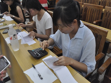 本次比赛的方式是手动输入40笔数据,用时最少者为胜。随着主持人的一声令下,选手迅速投入了比赛。比赛紧张激烈,同学们争分夺秒,一只手不停的按着计算器的按键,另一只手翻着传票,他们娴熟的手法,清醒的头脑,稳健的姿态,无不让观众为之喝彩。