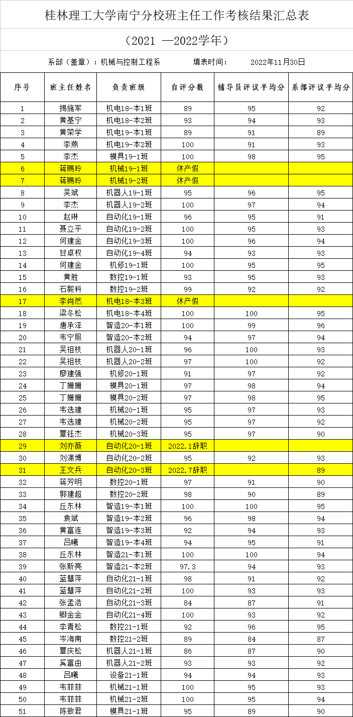 根据《伟德国际victor·1946源自班主任工作管理办法》(桂理工南分校学〔2016〕3号)和《伟德国际victor·1946源自班主任工作年度考核实施细则》(桂理工南分校学〔2016〕4号)的文件精神,经班主任个人自评、辅导员评议、系部评议。现将打分结果进行公示,公示期为2022年11月30日至12月2日,如有异议,请于公示期内向李杰老师反映情况。 联系人:李杰 联系方式:0771-5075920 附:考核打分结果: