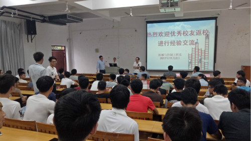 11月2日下午,机械系邀请到分校06届数控技术专业2位优秀校友,伦茨(传动)系统有限公司业务发展部总监刘忠平、广州诚智机械有限公司总经理郑雄元返校进行经验交流。交流会在启智楼108教室举行。分校学工部主任韦宁照,机械系党总支书记袁斌,辅导员陈平东、韦选建,机械系共200多名学生慕名参加了交流会。