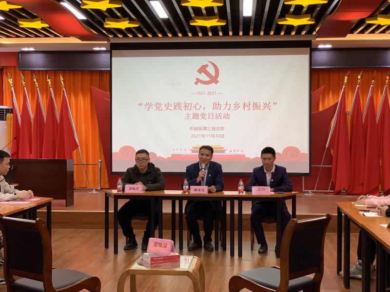 在中国共产党百年之际,“十四五”开局之年。为提高机械系第三党支部党员的政治理论修养、党性修养和综合素质,提高理论水平,端正入党动机,坚定理想信念。我系第三党支部于11月30日星期二下午16:30在党员活动中心开展“学党史践初心,助力乡村振兴”主题党日活动,分校党委副书记唐承泽、电气系团总支书记梁喻深,机械系第三党支部书记王行参会,机械系第三党支部党员、发展对象、积极分子与会。