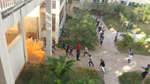 下午三点半, 当急促的警报声响起,全体师生按事前演练方案及逃生路线,历时4分钟组织了全部学生有序的从宿舍中撤离到宿舍门口的空地,整个演练过程做到快速、安全、有序。随后,全体师生集合在宿舍门口上进行了演练总结。