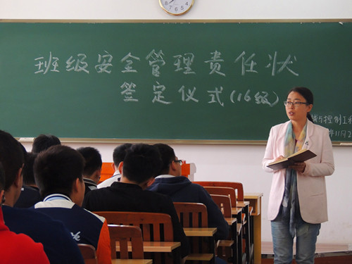 仪式开始,先由各班级代表宣读班级安全管理责任状,随后学工组组长莫天荣老师、辅导员李肖然老师、辅导员张业娟老师分别进行发言,对班级安全管理责任状的条例进行详细说明,强调了应注意学习与生活各方面关于安全的问题及注意事项,并要求各班班干监督好本班同学的学习和生活,对违纪行为和隐藏的不安全因素及时进行劝诫和防范,遇到不可控情况及时告知辅导员解决;最后,各班班干代表签署班级安全管理责任状。