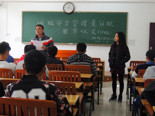 11月25日中午12点,我系于3栋藏修楼3203、3204教室举行“机械与控制工程系班级安全管理责任状签字”仪式,我系学工组组长莫天荣老师、我系辅导员李肖然老师、我系辅导员张业娟老师及15、16级各班班长、副班长、纪律委员、学习委员、生活委员、体育委员出席了本次仪式。