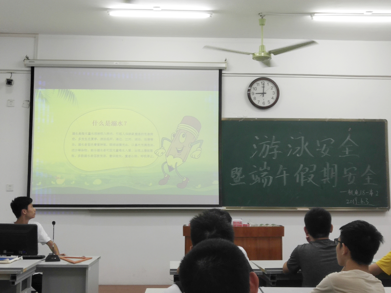对于安全方面的问题,团支书分别就游泳的注意事项、溺水的急救方法、落水不要错误施救、落水后如何自救等游泳安全问题进行了详细讲解。紧接着,团支书提醒同学们假期期间亦不可忘记基本的安全问题,并列出假期的注意事项,其后讲到了出行交通安全、人身财产安全、住宿饮食安全方面的问题。