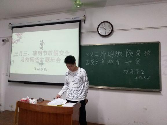 会议伊始,班长蒋鸿给我播放关于强调三月三安全的ppt演示文档,然后指出清明放假要注意的一些安全事项,重点强调了校园贷的问题,要求我们切记不要超强消费,不要碰这些方面的软件,触及到我们个人隐私的,要认真仔细观察。班会最后,委员给我们讲解了清明节的由来,并再次强调清明放假的注意事项。