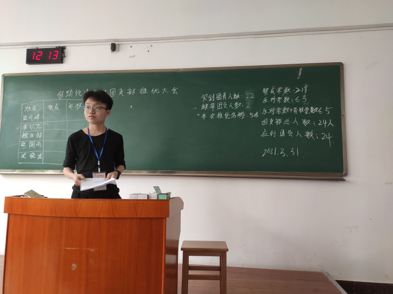 学习新思想,争做党的先锋。自动化19-4班全体同学于2021年4月1日晚12:10分在3栋藏修楼3204教室开展了党员推优竞选班会,与会的有自动化19-4班全体成员、陪同监督的有系团支部组织部成员,还有唐淑贞老师。本次参与推优的班级同学有5名,因到团员24人、实到团员23人。