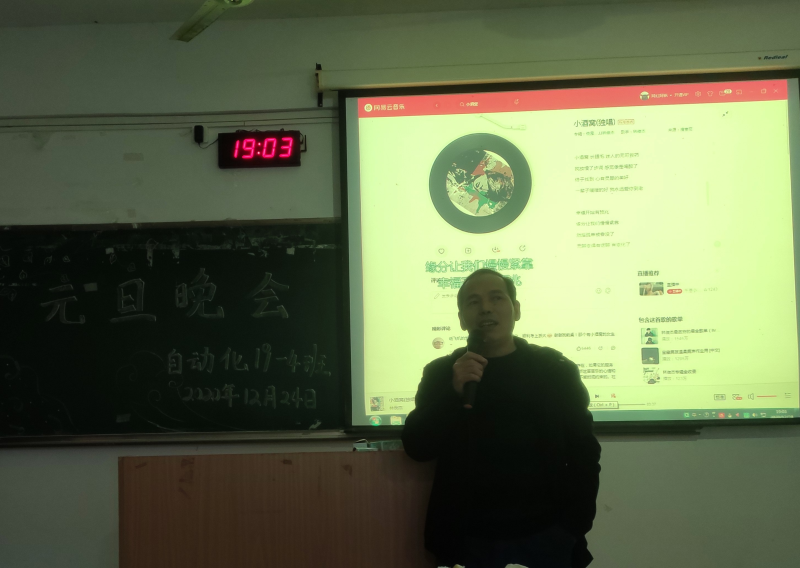 2020年12月24日晚18:00点,在物华楼6204,我系自动化19-4班组织开展了一场班级的“元旦晚会”。此次晚会旨在进一步推进班级同学增进友谊、班级团结,丰富班级文化,活跃班级气氛,促进交流为目的开展。参加班级晚会的有自动化19-4班全体同学、班主任甘卓权老师、班助梁苗学姐。