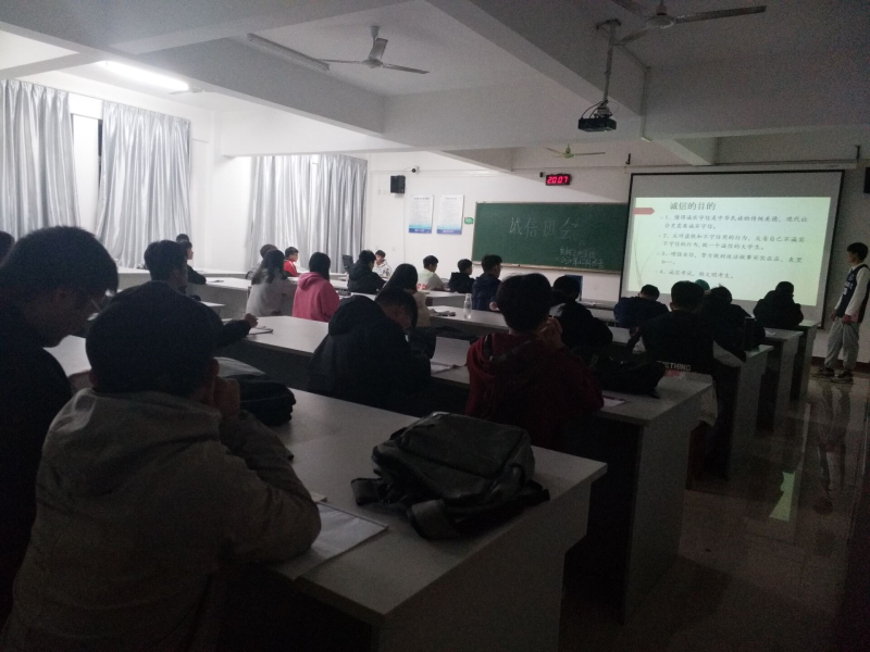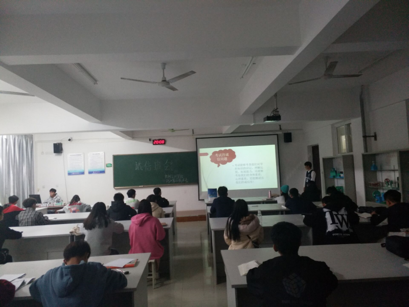 在班级各班委的组织下,班级管理的井然有序。此次班会旨在提倡同学们树立诚信的良好品质,在生活中坚持“诚信为本”,养成诚信的好习惯,特别是在四六级考试和期末考试中,诚信考试尤为重要。