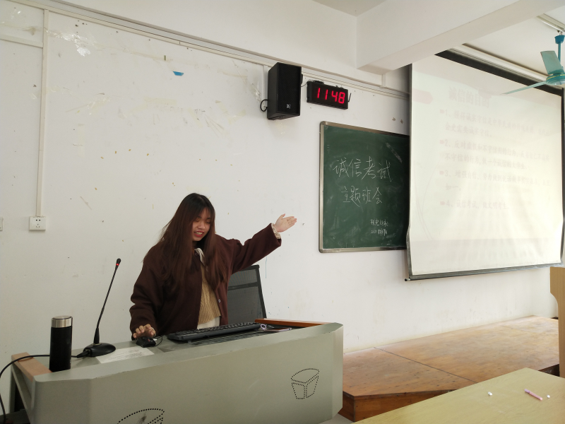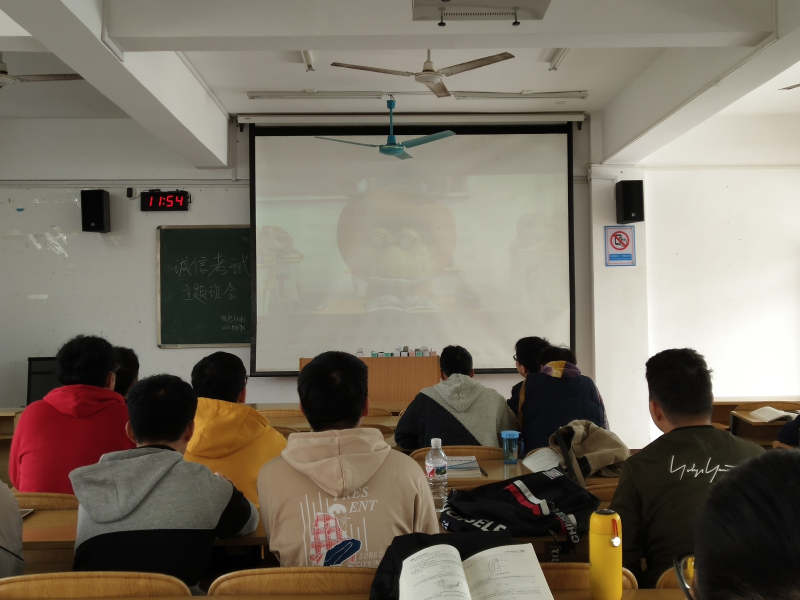 此次班会首先谈的诚信的目的,号召同学们诚信考试,做文明考生。紧接着分析了考试作弊的各方面原因以及心理危害,警戒着同学们不要陷入诚信危机,因“小”失大。其后,向同学们声明法律法规、学生手册对于考试违规的处理办法,以此来表明考试作弊有风险、不可行。接着,全体同学一同观看超萌中国考试诚信宣传片。