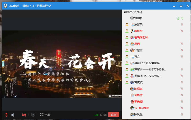 班会是以QQ群通话的形式进行。班会先由心理委员组织本班同学进入通话中,待同学全部加入通话,班会开始。班会分有疫情影响、防护措施、心理防护、关爱生命等四个方面内容,并结合《生命炙热》疫情公益短片、暖心疫情微视频《春望》、疫情防控心理干预宣传片《春天花会开》等视频来开展班会。