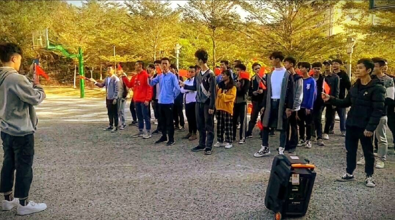 如下图,正在本次活动主题第一环节,集体奏唱国歌,每一位同学都手握国旗,佩戴团徽。唱着国歌手里挥舞着国旗,庄严神圣。