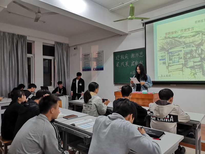 此次会议有五个部分。首先在团支书林志锐主持下奏唱国歌,在声声嘹亮的歌声中,充满了全体师生对祖国的热爱与崇敬之情。然后观看我校的校宣传片,校宣传片清楚地讲述了学校的历史与荣耀,这不禁使我们为身为桂工人而感到自豪。接着在林志锐主持下观看了禁烟宣传片和代表发言。在演讲中,大多数人都有讲到了迎接校庆,感谢师恩,展望未来,并对自己提出了一定的要求,还对学校由衷的祝福。