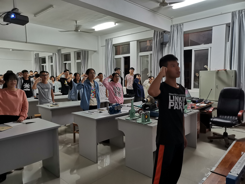 首先是全体成员起立奏唱国歌,国歌是一件严肃的事情,这也是一种表达爱国的情感。2019年是中华人民共和国成立七十周年,中国赶上了时代,实现了中国人民从站起来到富起来、强起来的伟大飞跃。从这次国庆阅兵中感受到了中国军队的强大震撼,人民军队永远是党的领导下的军队,永远是国家、社会主义、人民利益的捍卫者。我们的团支书提出了两个问题,同学们积极参与回答,从中可以知道同学们时刻也在关注国家发展,在团支书岑近的带领下让我们更多了解当代共青团员的义务与责任,正确对待自己的义务和权利,提高自身素质,发挥模范作用,对于保持和增强团的先进性,完成团的各项工作任务都具有重要意义。最后全体成员起立,宣誓入团誓词,再奏唱团歌《光荣啊,中国共青团》。为实现伟大梦想必须苦干实干,撸起袖子加油干。作为主持这次团会的岑近宣布此次团会圆满结束。