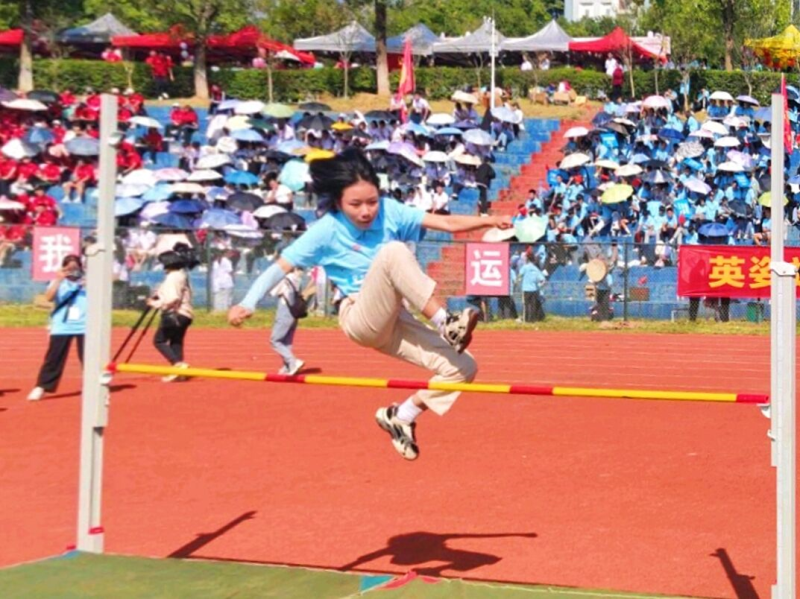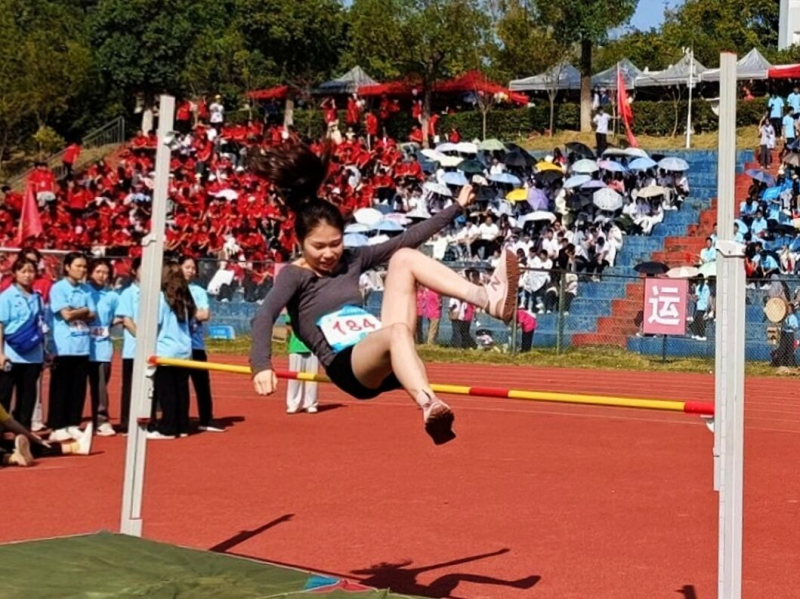赛场上运动员们的热情在一声声的呐喊声中高涨,无数日夜的努力在这一刻得到绽放。我系跳高运动员助跑,起跳,腾空,落地,用那矫健的身躯,冲刺着一个又一个的高度,最终,我系陈绵绵、吴玟雨同学分别取得了第二名、第三名的佳绩。