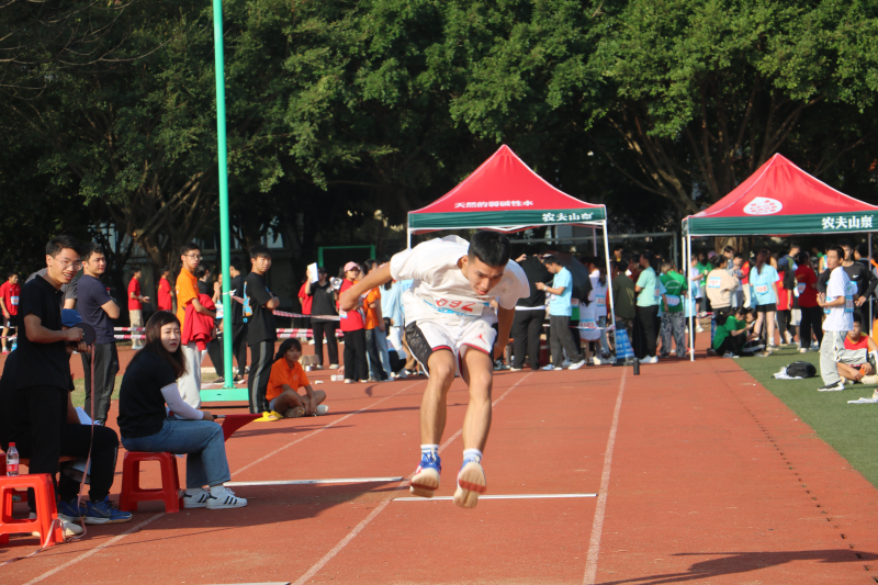我系运动健儿们在赛场上,眼神坚定,整装待发,少年义气,斗志昂扬。运动健儿们踏条腾空、跨步一跳、划出弧线,空中矫健的姿态,都是他们努力的结果。我系陈博文努力突破自我,以11.20米的成绩取得了第六名。