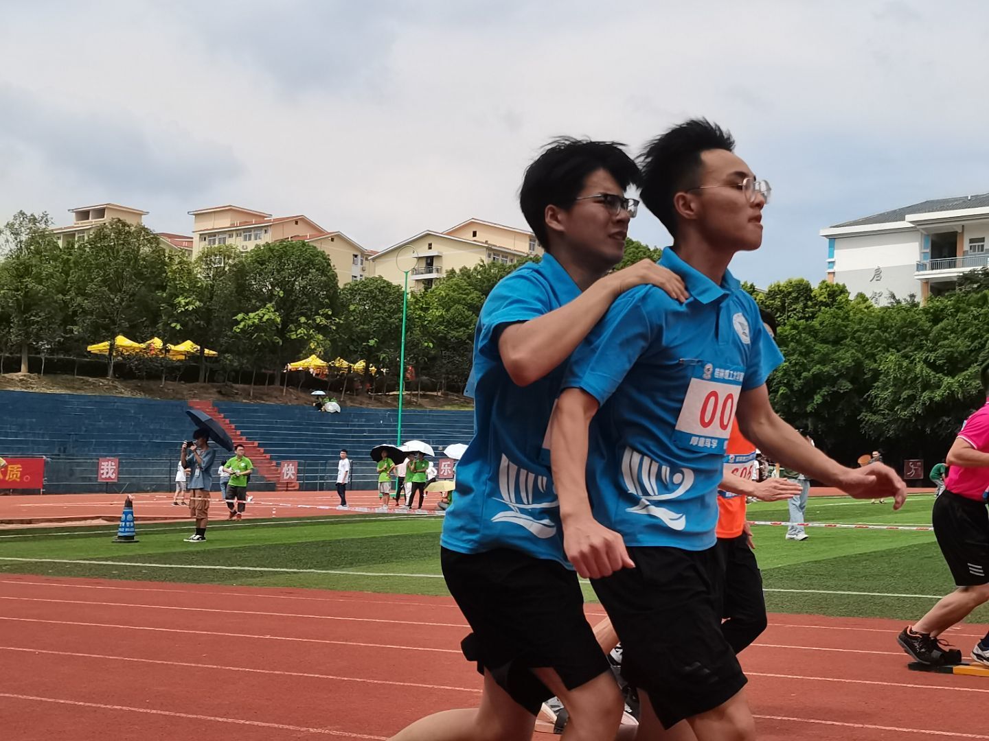 预备号打响,参赛运动员踏入跑道,潇洒的背影在跑道上飞扬。一二一,两人一足,共同的脚步,同一个目标,奋力向前,齐心协力冲向终点。赛道上你追我赶,奋勇前进拼搏来自昂扬激情,终点线并不遥远,就在加速、超越、冲刺的尽头。