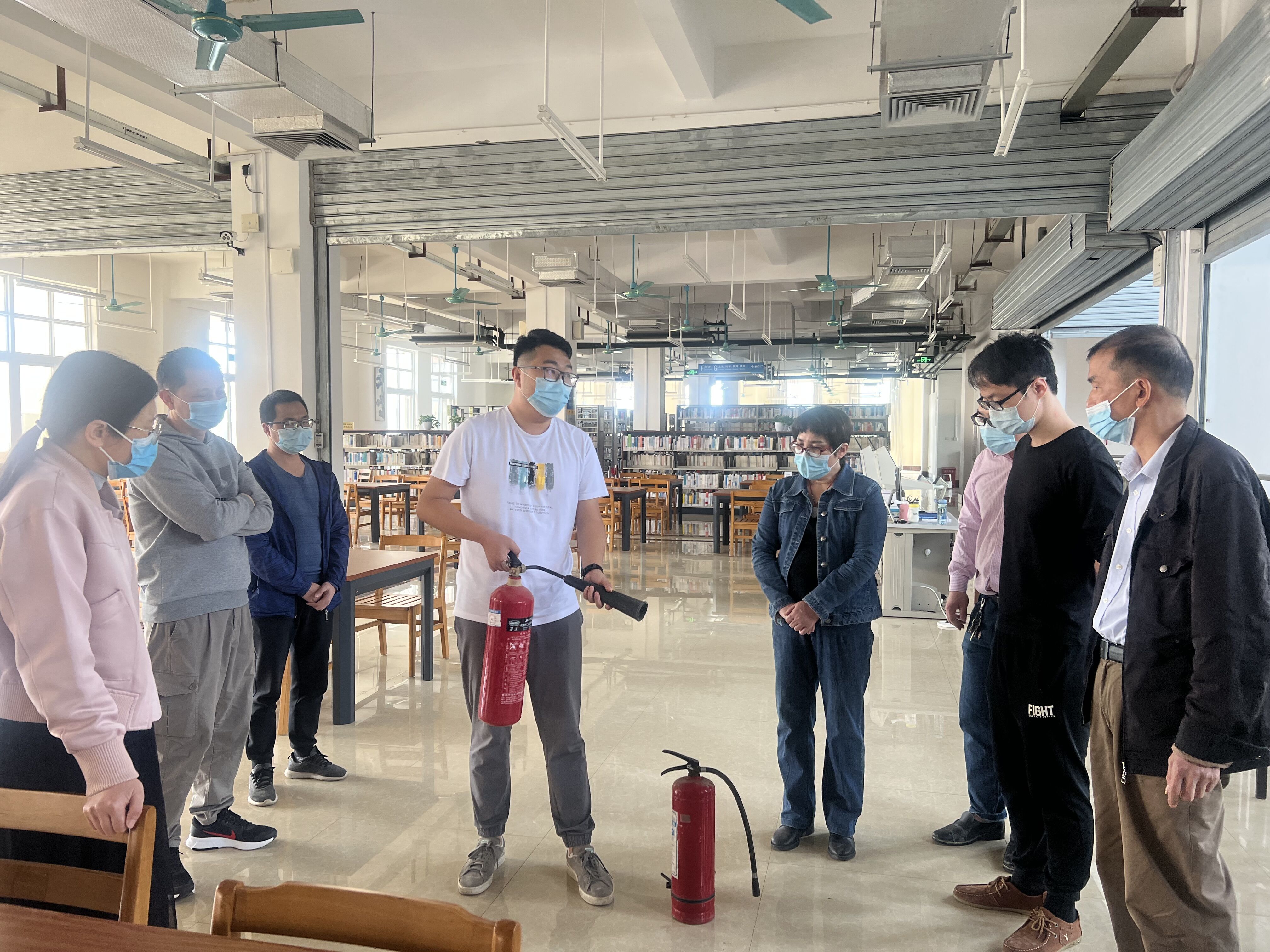 活动中,首先由图书馆消防安全员葛老师对常见火灾的处置、灭火器材的操作方法、火灾报警、初起火灾的扑救和应急疏散流程等进行了详细讲解和演示。随后全体馆员积极参加了火灾模拟应急疏散演练。